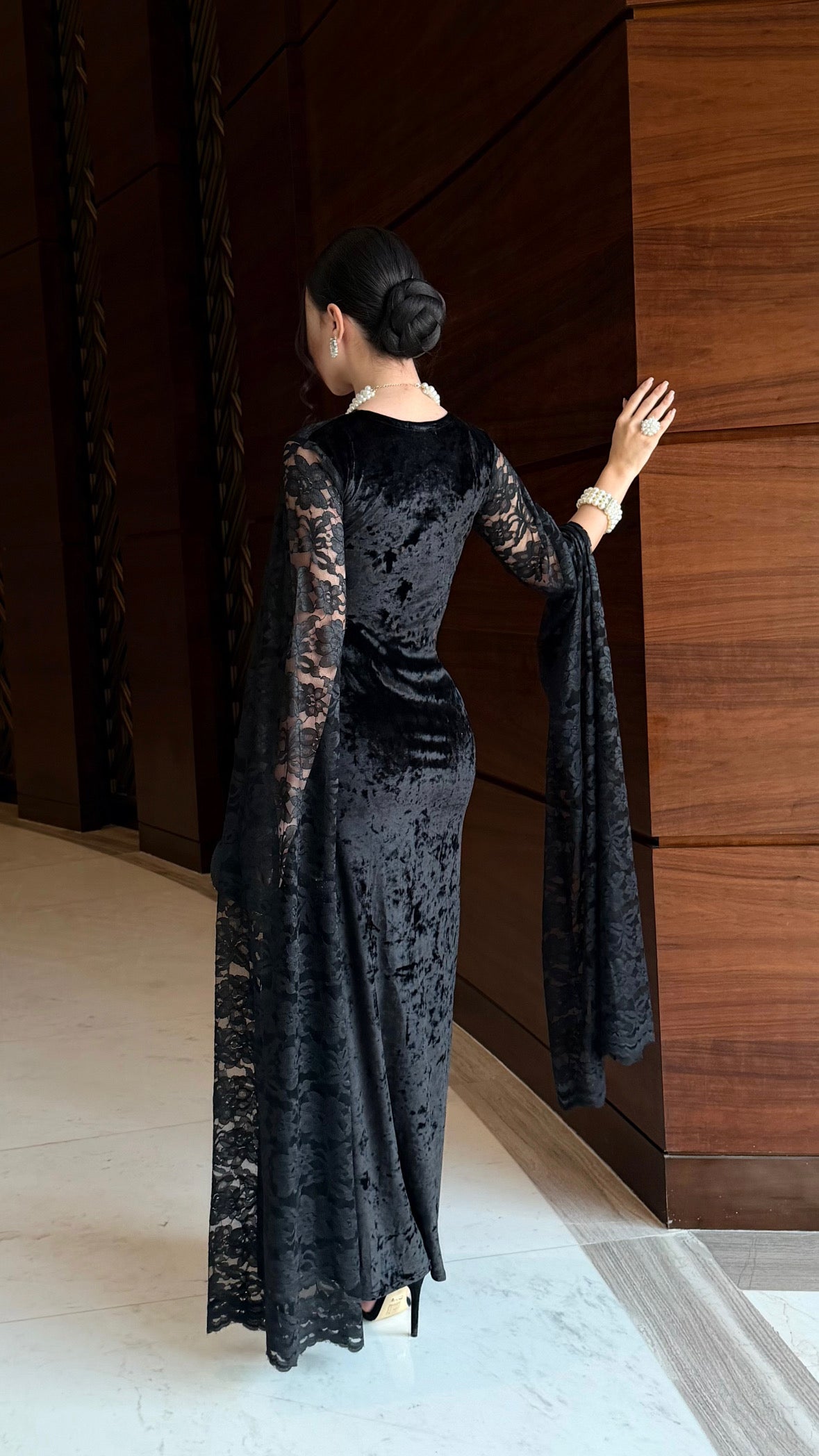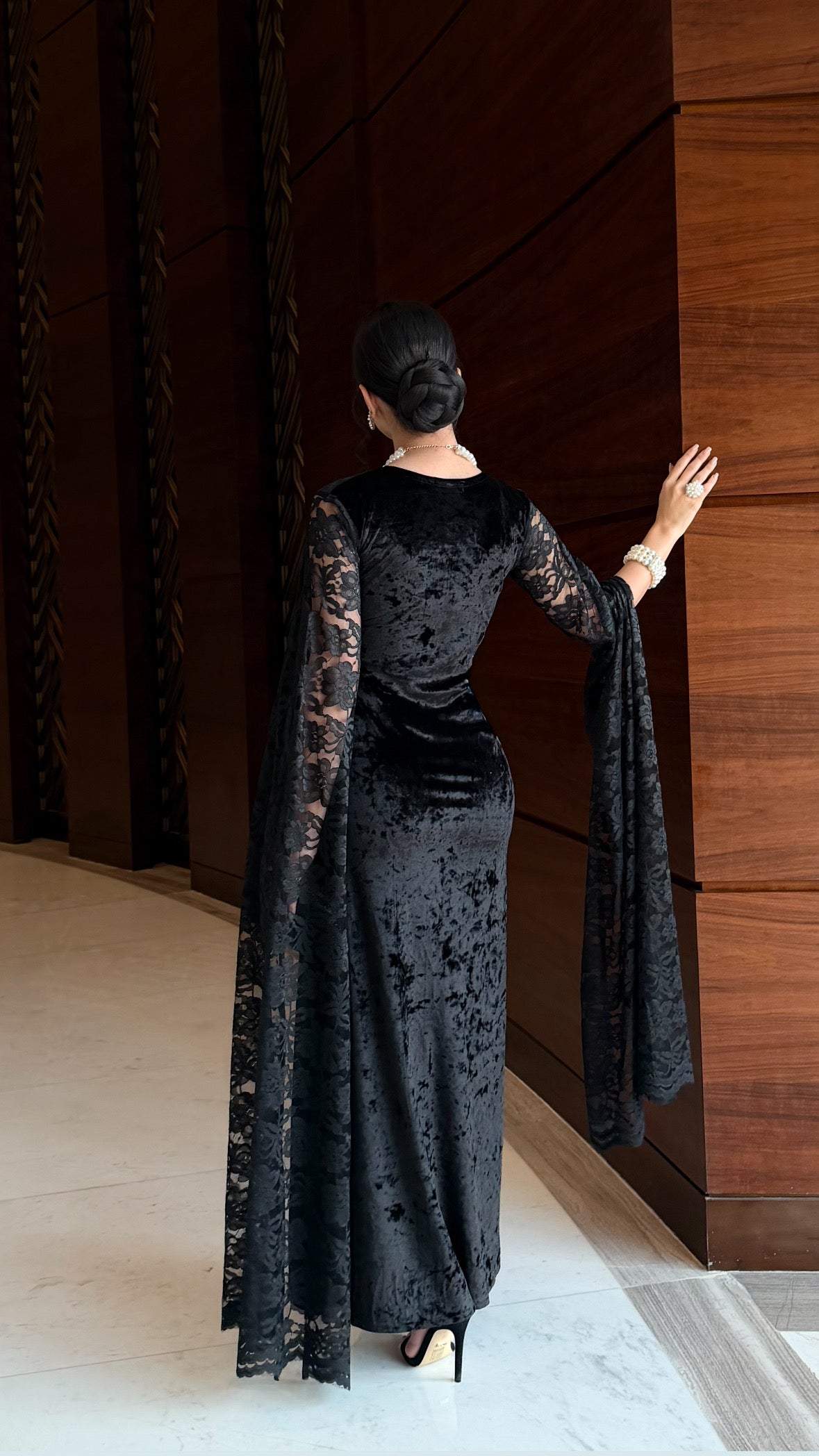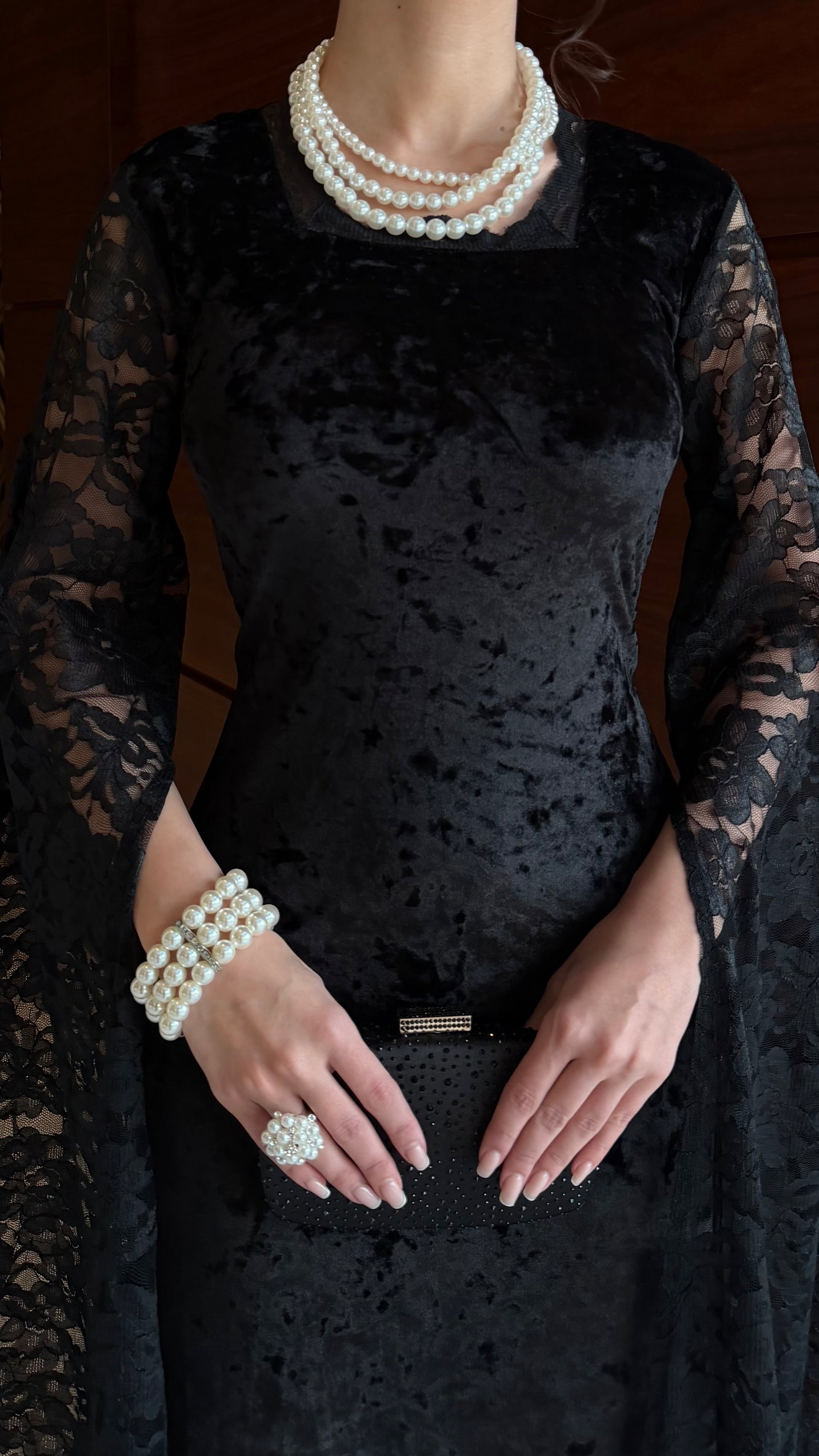 فستان مخمل ستريتج مع دانتيل فرنسي اصلي